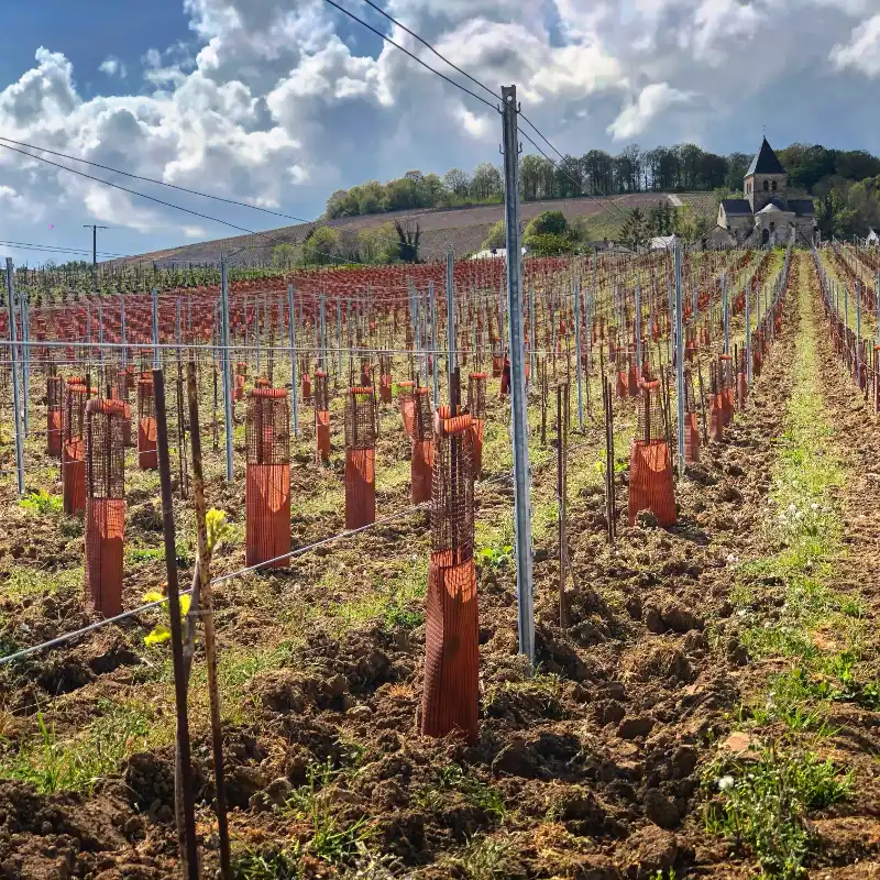 Nous entretenons nous-mêmes nos parcelles. Depuis 2023, un robot électrique autonome, le Vitibot, travaille trois de nos parcelles à Cuisles et Jonquery.